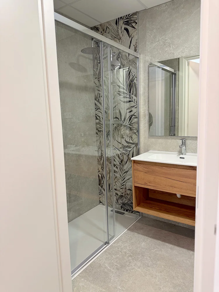 Il gres porcellanato effetto pietra rende i bagni pregiati e contemporanei, le venature e i movimenti tipici della pietra li arricchiscono senza appesantire, donano movimento e amplificano lo spazio. La decorazione presente nelle docce, ovvero il gres porcellanato effetto carta da parati, aggiunge poi quel tocco in più, un mix di giocosità floreale e relax, una scelta di stile particolarmente azzeccata.