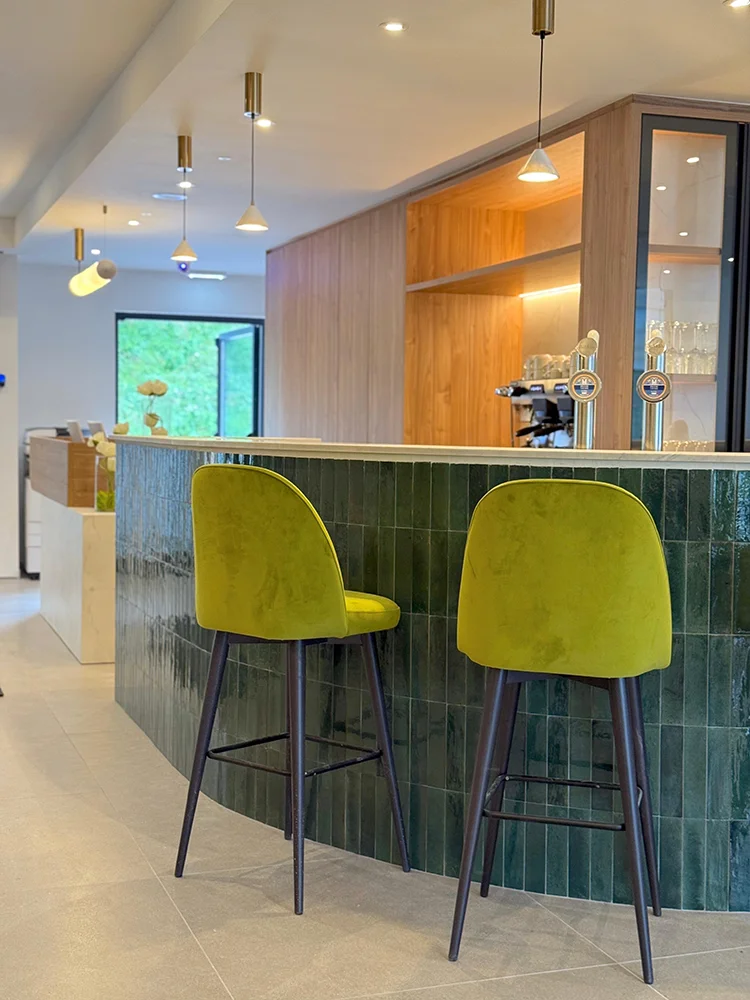 Colori più caldi sono stati pensati per le zone comuni, come la hall e la sala dedicata alle colazioni. Sempre gres porcellanato superficie soft, sempre un grande formato, e sempre un’icona di stile, le cromie del beige che contrastano con il verde acceso scelto per i listelli del rivestimento del bancone.